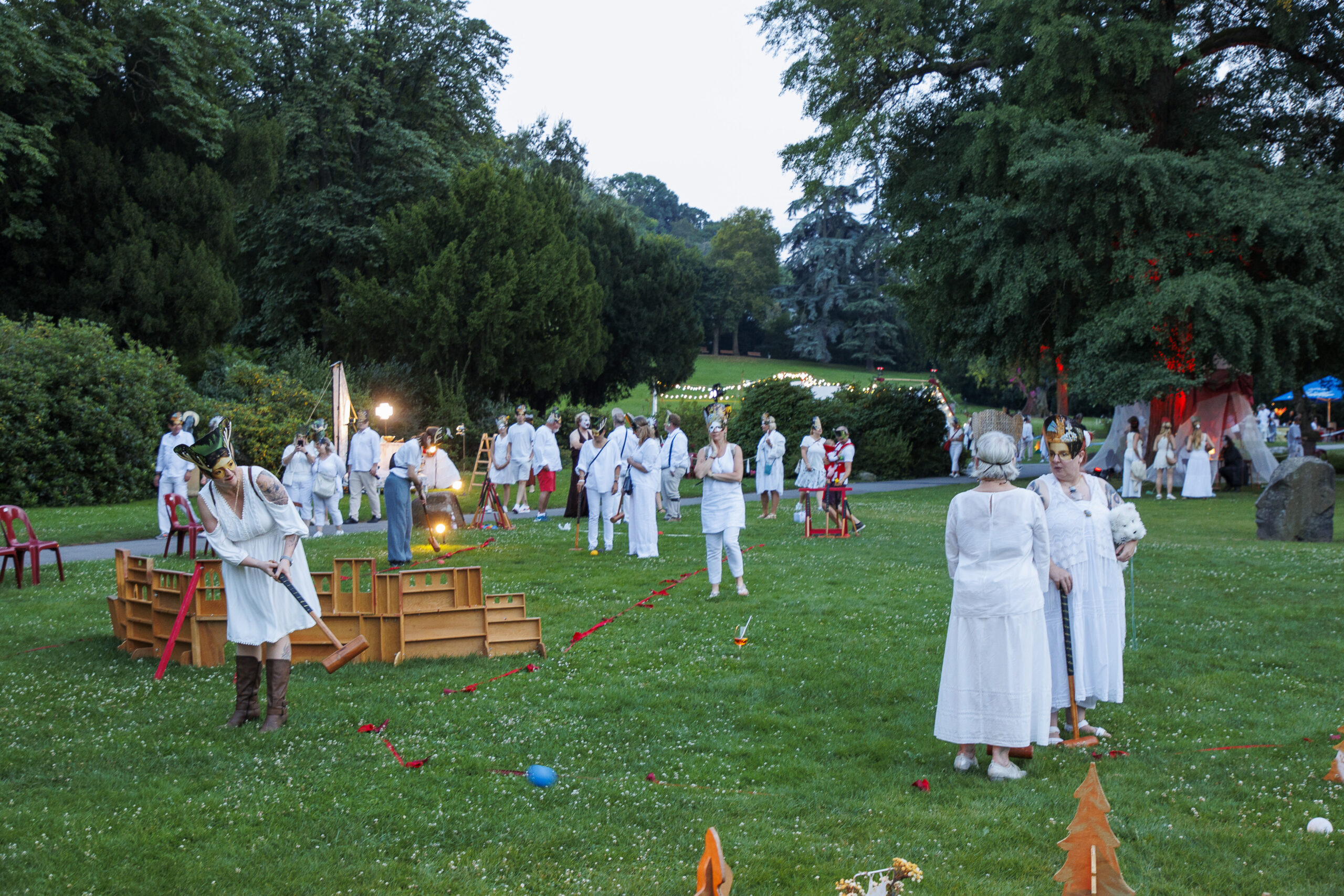 Wann waren Sie das letzte Mal auf einem Maskenfest? MASQUERADE lädt Sie herzlich dazu ein! Und nicht nur das, wir feiern gemeinsam das Ende einer Jagd. Die Jagdgesellschaft kehrt erfolgreich zurück und bereitet sich auf ein rauschendes Fest vor… Eine Maske erhalten Sie beim Betreten des Festgeländes. Spielen Sie mit uns! Finden Sie heraus, was es bedeutet, „inkognito“ zu sein – ob nun durch das eigene Tragen der Maske oder durch das Zuschauen, wie sich unserer Künstler und Künstlerinnen begegnen, Königsgeschichten erzählen, Verführungen unterliegen und sich tierischen Kräften aussetzen. Tanzplätze warten auf Sie. Geschichten und Amüsement! Nehmen Sie den Krocket-Schläger in die Hand und jagen Sie den weißen Hirschen…